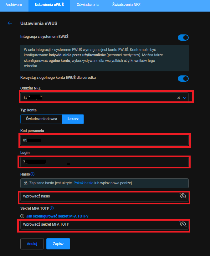 Po wprowadzeniu ustawień eWUŚ, proszę koniecznie pamiętać o kliknięciu w przycisk poniżej - bez włączenia nie zadziałają ustawienia eWUŚ dla konta lekarza - prosimy kliknąć w przycisk i włączyć użycie ustawień dla wizyt danego lekarza. Aby zatwierdzić ustawienia w Aurero, proszę kliknąć przycisk zapisz