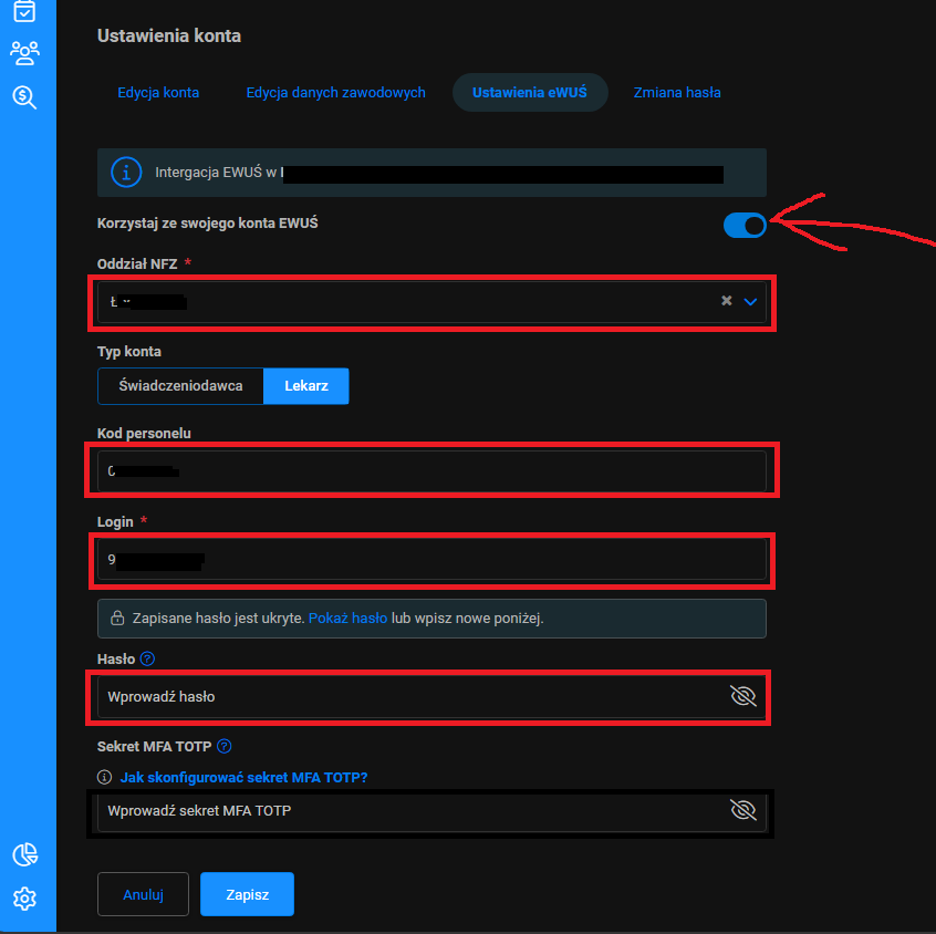 Jeśli chcieliby Państwo skonfigurować widoczność statusu ubezpieczenia Pacjentów wyłącznie dla jednego Lekarza, Lekarz powinien (oprócz uzupełnienia zakładki "Edycja danych zawodowych" w zakresie numeru PWZ i certyfikatu ZUS) wejść w ustawienia swojego konta i przejść do zakładki "Ustawienia eWUŚ", a tam uzupełnić dane zgodnie z wygenerowanym dla Lekarza dostępem do eWUŚ.