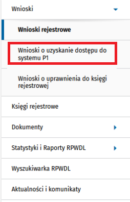 Jeśli użytkownik nie posiada na swoim koncie uprawnienia do księgi rejestrowej, należy najpierw złożyć wniosek o nadanie uprawnień do księgi rejestrowej (druga opcja w powyższym widoku) - zanim będzie możliwe złożenie wniosku o uzyskanie dostępu do systemu P1