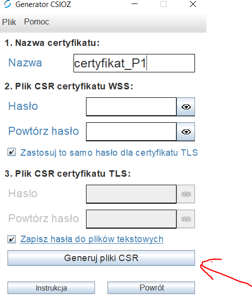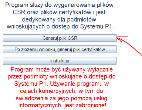 14. Po pobraniu plików z użyciem linków, należy ponownie otworzyć aplikację Generatora plików CSIOZ. W generatorze należy wybrać opcję "Po złożeniu wniosku, generuj pliki certyfikatów P1"