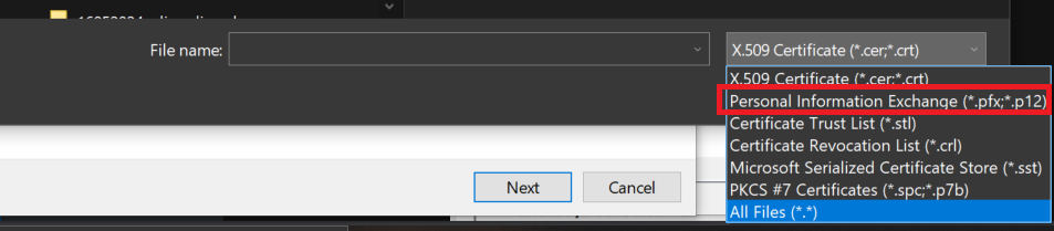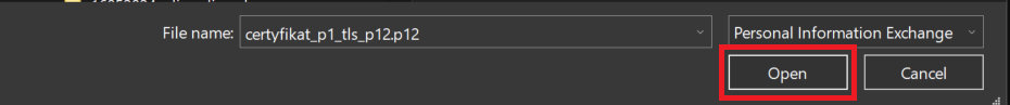 Wybierz swój plik .p12 / .pfx z dysku lokalnego i kliknij Otwórz.