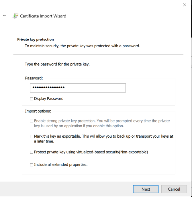Zaznacz opcję „Oznacz ten klucz jako eksportowalny...” (jeśli chcesz mieć możliwość wykonania kopii zapasowej w przyszłości) i kliknij Dalej.