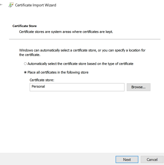 W Kreatorze importu kliknij Przeglądaj..., wybierz typ pliku *.p12, wybierz swój plik i kliknij Dalej.