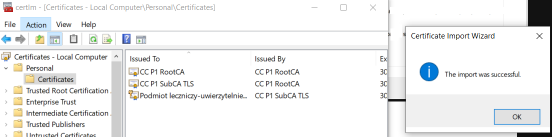 Proszę pamiętać, że aby móc sprawdzić datę ważności dla pliku certyfikatu, należy znać hasło do pliku użyte przy generowaniu pliku (należy wykonać sprawdzenie osobno dla plików certyfikatu P1 (pliki TLS i WSS z rozszerzeniem P1), osobno dla certyfikatu lekarza (plik PFX).