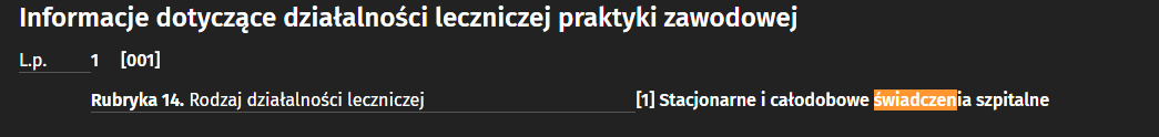 b. Dla Praktyki Lekarskiej / Gabinetu - Wartość kodu V zależy od formy wykonywania zawodu, identyfikujący świadczenia. Zgodnie z wytycznymi Izb Lekarskich W sekcji "Informacje dotyczące działalności leczniczej" w RPWDL2 - Kod w nawiasie (np. [001] lub [99]) to kod resortoy V - najczęściej zawiera wartość 01 lub kody z przedziału 93-99. Przykładowy widok: