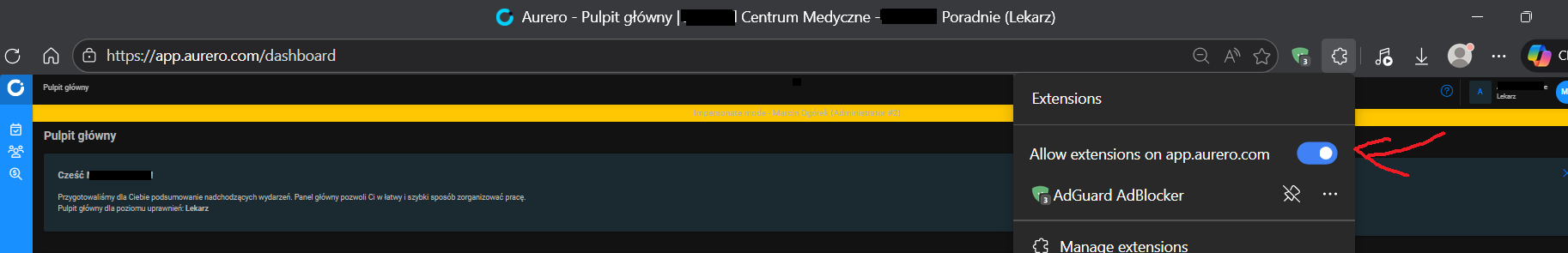 - Rozszerzenia: Prosimy o wyłączenie wszystkich rozszerzeń (extensions) w przeglądarce. W tym celu, prosimy np. w przeglądarce Google Chrome, wpisać w pasku adresu przeglądarki chrome://extensions/ i wyłączyć suwaki przy wszystkich dodatkach (przesunąć w lewo na pozycję wyłączoną). Należy w wyszukiwarce kliknąć w Rozszerzenia i wyłączyć (np poniżej widok w Edge)