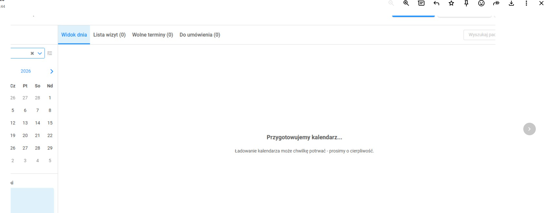 Opis problemu: Brak dostępu do kalendarza / nie wczytuje poprawnie kalendarza - widok w systemie w chwili wystąpienia problemu: